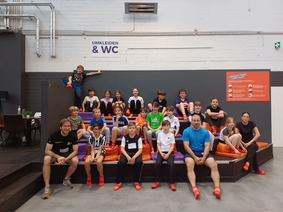 Zwanzig Kinder bis zwölf Jahre verbrachten am 10. Mai eine sportliche Stunde im Jump House Köln-Ossendorf, begleitet von fünf Betreuer*innen. Mit Trampolin-Brennball, Saltos und viel Bewegung auf Luftkissen wurde der Ausflug zu einem vollen Erfolg.