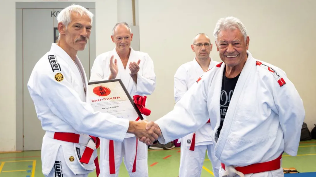 Im Rahmen eines Landeslehrgangs, der von unserem Verein ausgetragen wurde, wurde Peter Kloiber mit dem 9. Dan überrascht. Sichtlich gerührt nahm er seinen neuen roten Gürtel und die Urkunde entgegen.